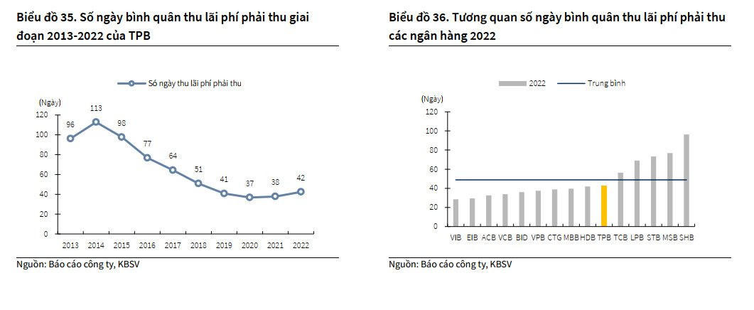 Mặt khác, KBSV cho biết chất lượng các khoản lãi phí phải thu của TPBank liên tục được cải thiện với số ngày thu bình quân lãi phí phải thu giảm từ 113 ngày năm 2014 xuống 42 ngày năm 2022, tương đương với tiêu chí kì hạn của nợ nhóm 2. Mặc dù đang có dấu hiệu tăng nhẹ trong giai đoạn 2021 – 2022, số ngày thu bình quân lãi – phí phải thu của TPBank vẫn đang thấp hơn trung bình nhóm các ngân hàng theo dõi là 49 ngày cho thấy TPB đang kiểm soát các khoản lãi phí phải thu khá tốt so với trung bình ngành.