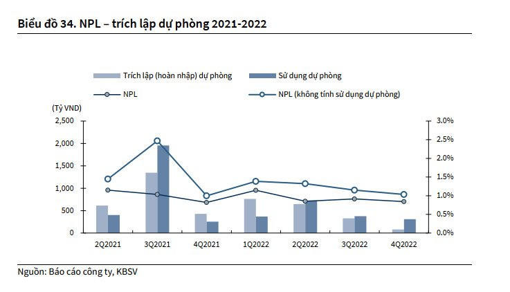 Nhóm phân tích cho rằng, trong năm 2021-2022, ngân hàng đã đẩy mạnh trích lập dự phòng và xử lý nợ xấu, giúp giảm tỷ lệ nợ xấu giảm từ mức 1,2-1,3% giai đoạn 2019-2020 về dưới 1%.