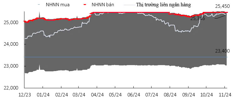 Giai đoạn đầu, áp lực trên tỷ giá liên tục tăng, đỉnh điểm là trong giai đoạn từ tháng 4/2024 đến tháng 7/2024, khi tỷ giá liên tục duy trì ở ngưỡng cao. Áp lực này chủ yếu đến từ chính sách thắt chặt tiền tệ của FED. Để kiềm chế lạm phát, FED liên tục tăng lãi suất và duy trì lãi suất ở mức cao từ tháng 8/2023.