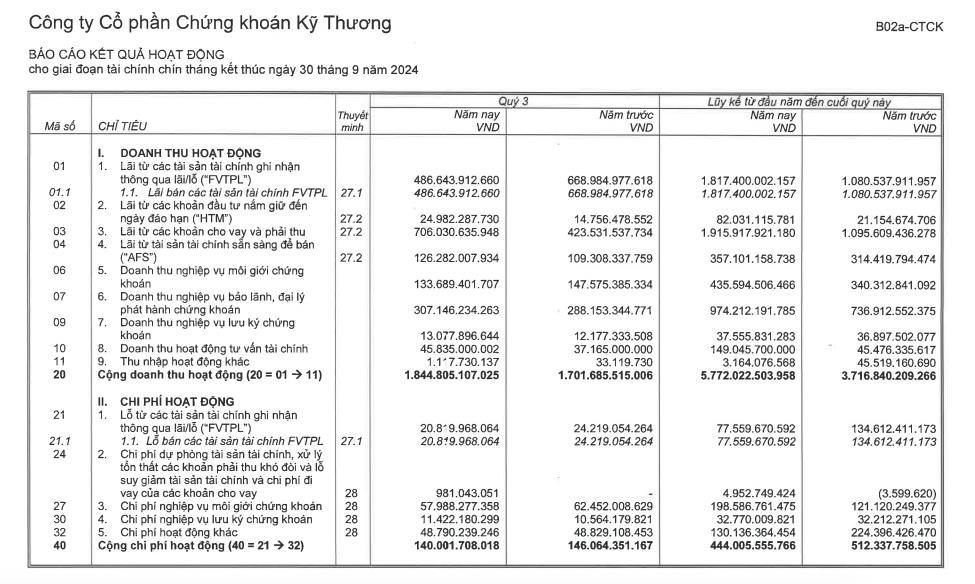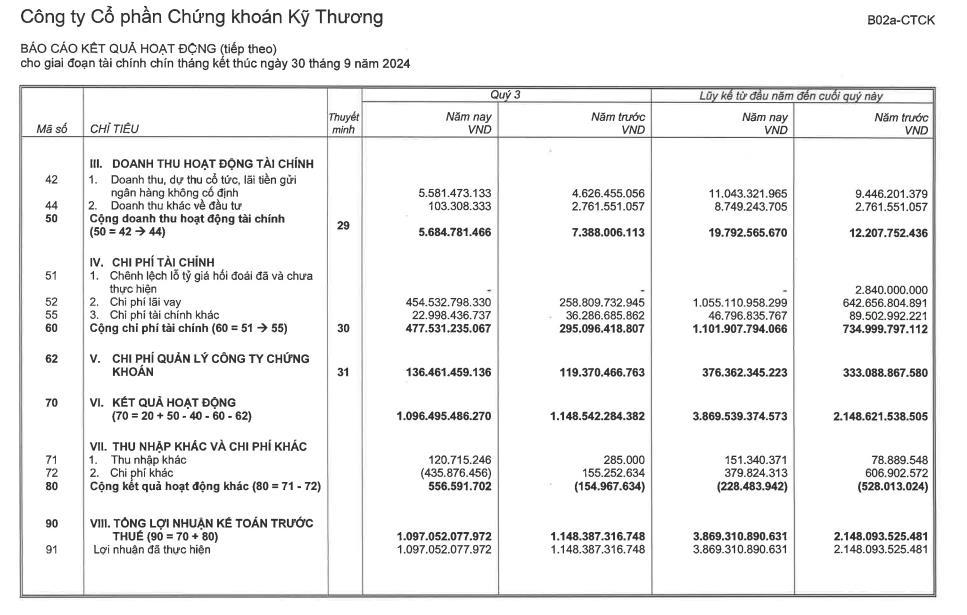 Về tình hình kinh doanh 9 tháng đầu năm 2024, TCBS ghi nhận doanh thu 5.772 tỷ đồng, tăng 55% so với cùng kỳ năm trước. Lợi nhuận trước thuế ở mức 3.869,3 tỷ đồng, tăng hơn so với con số 2.148 tỷ đồng ở cùng kỳ năm 2023.
