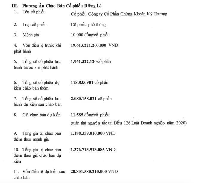 Theo đó, TCBS dự kiến chào bán thêm 118,8 triệu cổ phiếu, với mức giá chào bán là 11.585 đồng/cổ phiếu, tương đương dự thu gần 1.377 tỷ đồng.