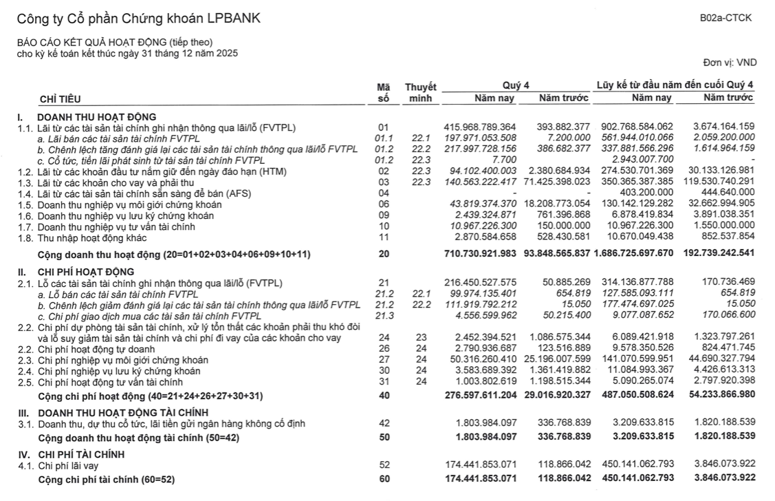 Về bức tranh tài chính, tính chung cả năm 2025, LPBS ghi nhận doanh thu hoạt động đạt 1.686 tỷ đồng, gấp 8,6 lần so với cùng kỳ. Lợi nhuận sau thuế đạt 522 tỷ đồng, gấp 6,5 lần kết quả đạt được trong năm 2024.