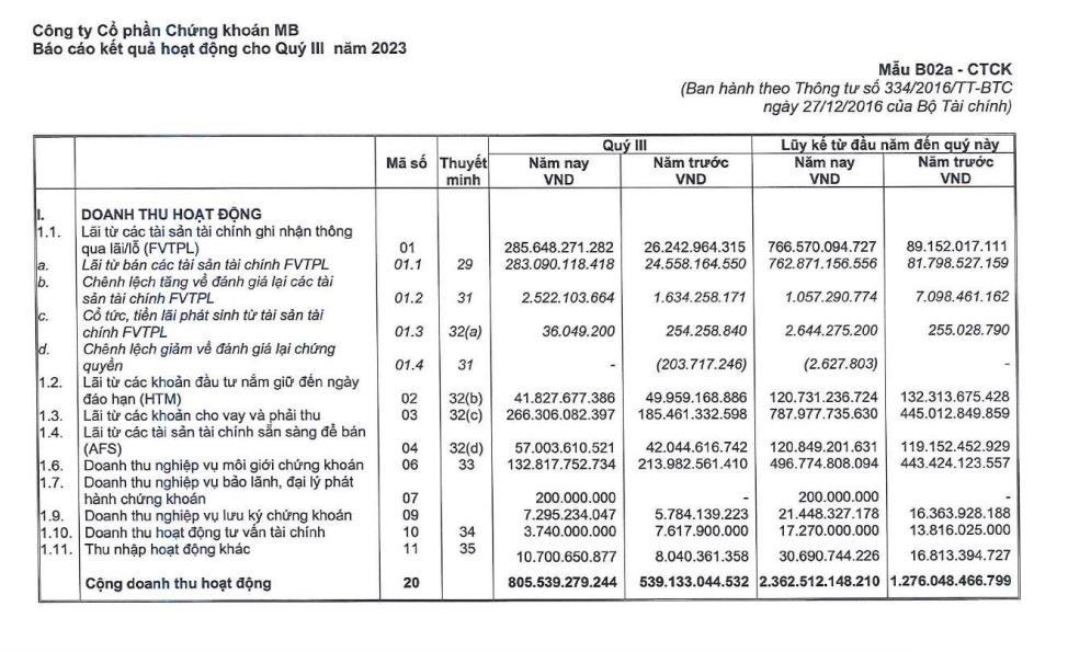 Luỹ kế 9 tháng đầu năm, Chứng khoán MB ghi nhận 2.363 tỷ đồng doanh thu hoạt động và 578 tỷ đồng lợi nhuận sau thuế, lần lượt tăng 85% và 40% so với cùng kỳ năm 2023.