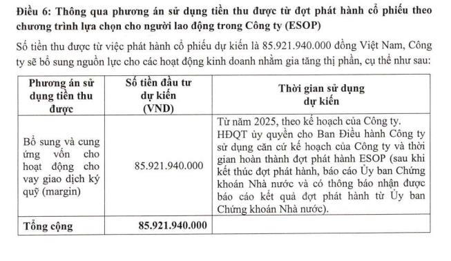 Thời gian thực hiện đợt phát hành cổ phiếu ESOP trên là trong năm 2025, mục đích là nhằm bổ sung và cung ứng vốn cho hoạt động cho vay giao dịch ký quỹ (margin).