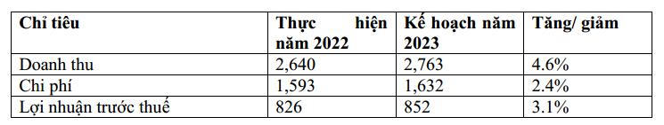 Công ty đề ra mục tiêu doanh thu 2023 ở mức 2.763 tỷ đồng, tăng 4,6% so với thực hiện năm 2022. Chi phí cũng dự kiến 1.632 tỷ đồng, tăng 2,4%. Cuối cùng, lợi nhuận trước thuế dự kiến 852 tỷ đồng, tăng 3,1%.