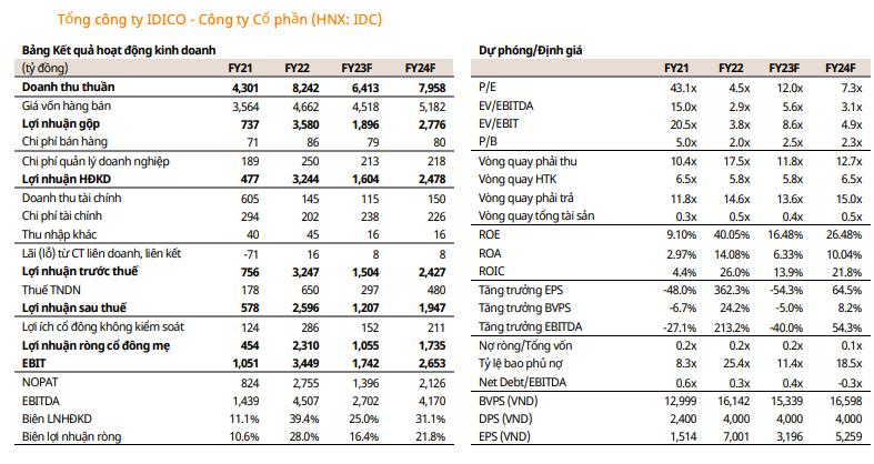 Trong báo cáo cập nhật mới đây, Chứng khoán Mirae Asset Việt Nam (MASVN) dự phóng năm 2023, Tổng công ty IDICO - CTCP (mã: IDC) đạt doanh thu 6.413 tỷ đồng và lợi nhuận ròng 1.055 tỷ đồng, lần lượt giảm 22% và 54% so với cùng kỳ năm trước.