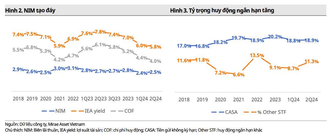 Đổi lại, ngân hàng sẽ có mức thanh khoản ổn định cũng như tỷ lệ hình thành nợ xấu thấp hơn, duy trì thu nhập từ lãi ổn định. NIM của ngân hàng được kỳ vọng tiếp tục hồi phục nhẹ trong thời gian tới với các yếu tố xúc tác như chi phí huy động bình thường hóa sau các đợt điều chỉnh giảm lãi suất huy động trong năm 2023; CASA cải thiện phần nào, lãi suất thị trường liên ngân hàng cũng được kỳ vọng giảm khi áp lực tỷ giá hạ nhiệt và mảng ngân hàng bán lẻ phục hồi.