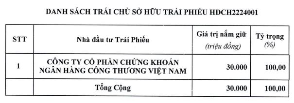 Được biết, theo văn bản công bố chỉ có duy nhất 1 nhà đầu tư tổ chức trong nước đã mua lại trọn lô trái phiếu này là Công ty cổ phần Chứng khoán Ngân hàng Công thương Việt Nam (CTS).