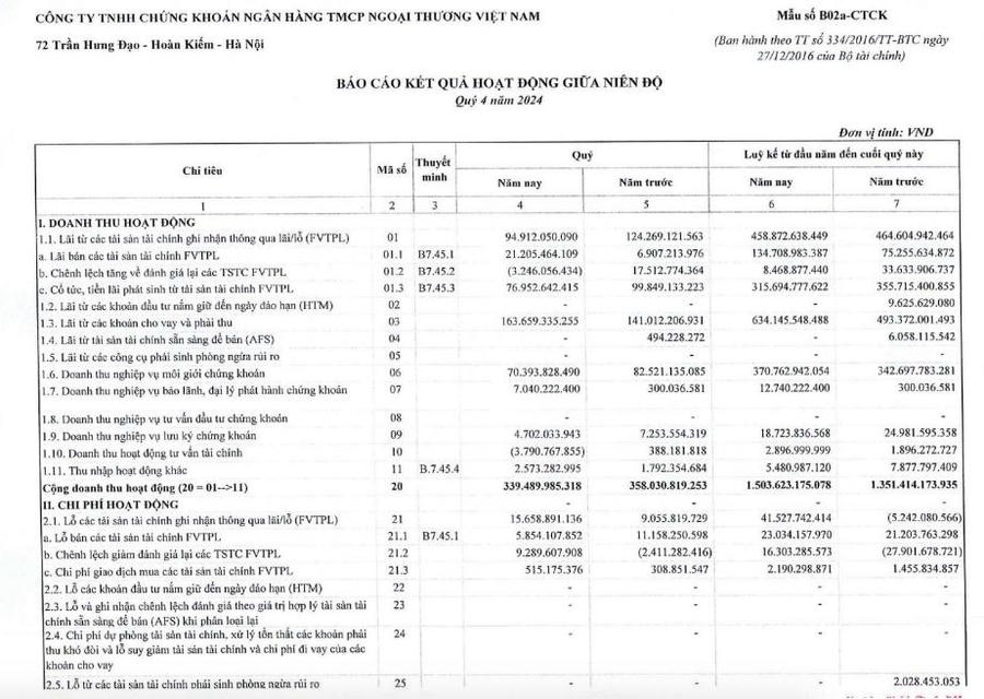 Tính chung cả năm 2024, VCBS ghi nhận doanh thu thuần đạt 1.503 tỷ đồng, tăng 11,2% so với năm ngoái. Lãi sau thuế đạt 508 tỷ đồng, tăng nhẹ so với năm ngoái ghi nhận ở 487,7 tỷ đồng.