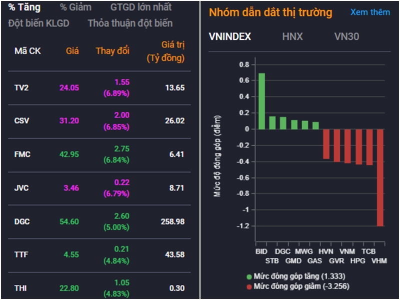 Thị trường chứng khoán Việt Nam hôm nay ghi nhận phiên giao dịch giằng co khá quyết liệt. Diễn biến thị trường ghi nhận tâm lý thận trọng ở cả bên mua và bên bán. Phần lớn các mã giao dịch quanh mốc tham chiếu cùng lượng thanh khoản thấp.
