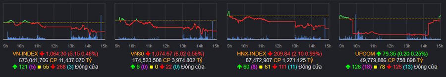 Kết phiên, VN-Index giảm 5,15 điểm (-0,48 %) xuống 1.064,3 điểm. HNX-Index giảm 2,1 điểm xuống 209,84 điểm và UPCoM-Index tăng 0,2 điểm lên 76,35 điểm.