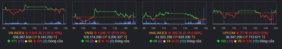 Kết thúc phiên giao dịch, VN-Index giảm 1,55 điểm (-0,15%), xuống 1,041.36 điểm; HNX-Index giảm 0,16 điểm (-0,08%), xuống 206,76 điểm. Độ rộng toàn thị trường nghiêng về bên bán với 395 mã giảm và 326 mã tăng.
