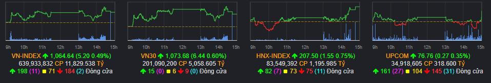 VN-Index đóng cửa ở mốc 1.064,64 điểm, tăng hơn 5 điểm, ghi nhận chuỗi 9 phiên tăng giá liên tiếp.