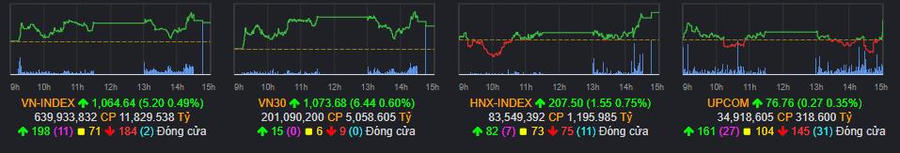 Kết thúc phiên giao dịch, chỉ số VN-Index tăng 0,49% lên 1.064 điểm; HNX-Index tăng 1,55 điểm (+0,75%), lên 207,5 điểm; UPCoM-Index tăng 0,27 điểm (+0,35%) lên 76,76 điểm. Giao dịch khối ngoại khá tích cực khi ghi nhận khoản mua ròng với tổng giá trị 180 tỷ đồng trên toàn thị trường.