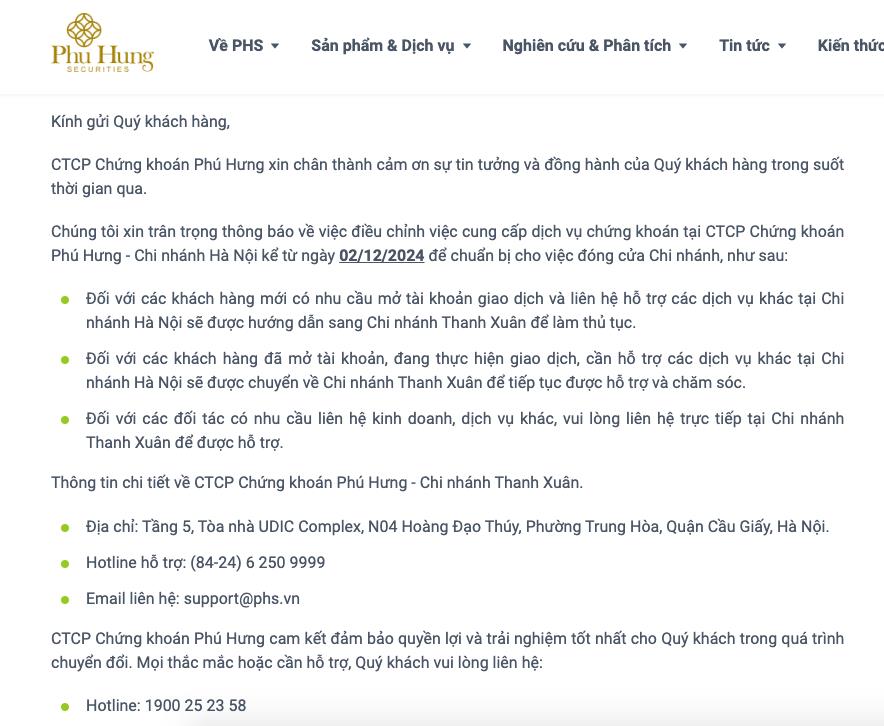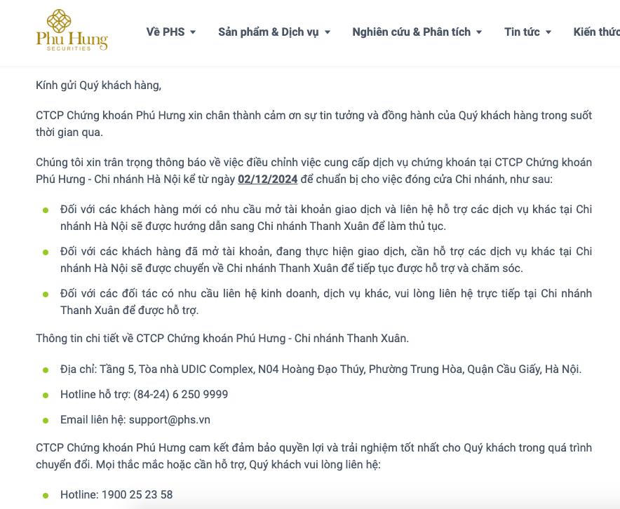 Thông báo trên trang web của PHS ngày 29/11 cho biết, kể từ ngày 02/12/2024, Công ty sẽ điều chỉnh việc cung cấp dịch vụ chứng khoán tại Chi nhánh Hà Nội để chuẩn bị cho quá trình đóng cửa.