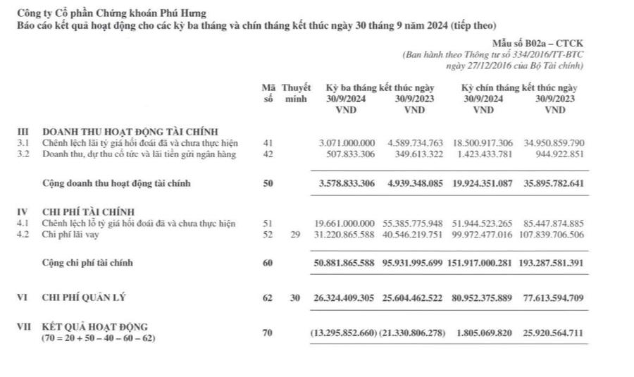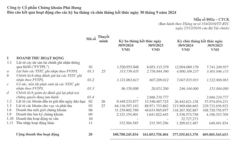 Theo báo cáo kinh doanh quý III/2024, Chứng khoán Phú Hưng ghi nhận doanh thu hoạt động đạt 108,8 tỷ đồng, giảm 32,4% so với quý III/2023.
