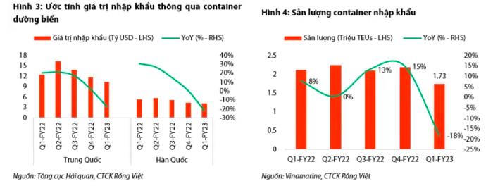 Giá trị nhập khẩu ước tính hàng hóa container thông qua đường biển đạt 31 tỷ USD, giảm 15%. Trong đó, hai thị trường nhập khẩu chính của Việt Nam là Trung Quốc và Hàn Quốc có thị phần tương ứng là 32% và 17% - đều tăng trưởng âm, giá trị nhập khẩu hàng hóa container đường biển ước tính lần lượt đạt 10,3 tỷ USD và 4,1 tỷ USD, giảm 18% và 22% so với cùng kỳ.