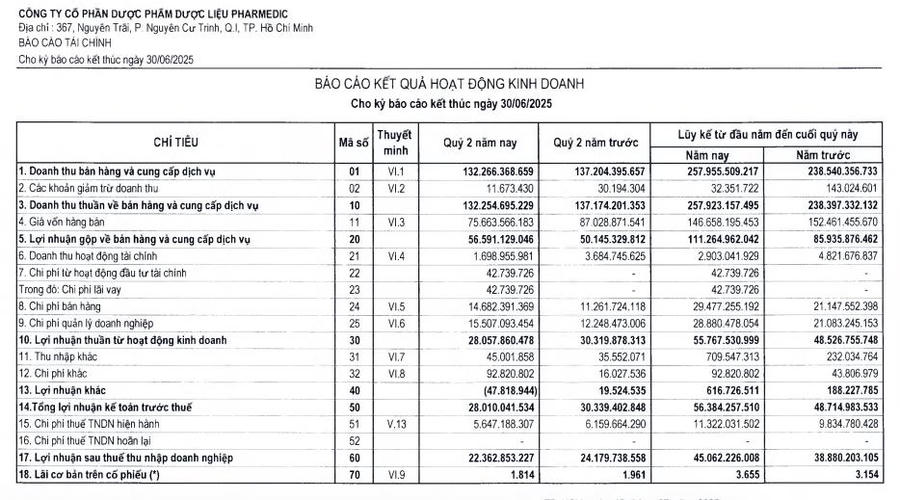 Tính trong nửa đầu năm 2025, PMC ghi nhận doanh thu thuần đạt 257,9 tỷ đồng, tăng 8% so với con số 238 tỷ đồng cùng kỳ năm ngoái.