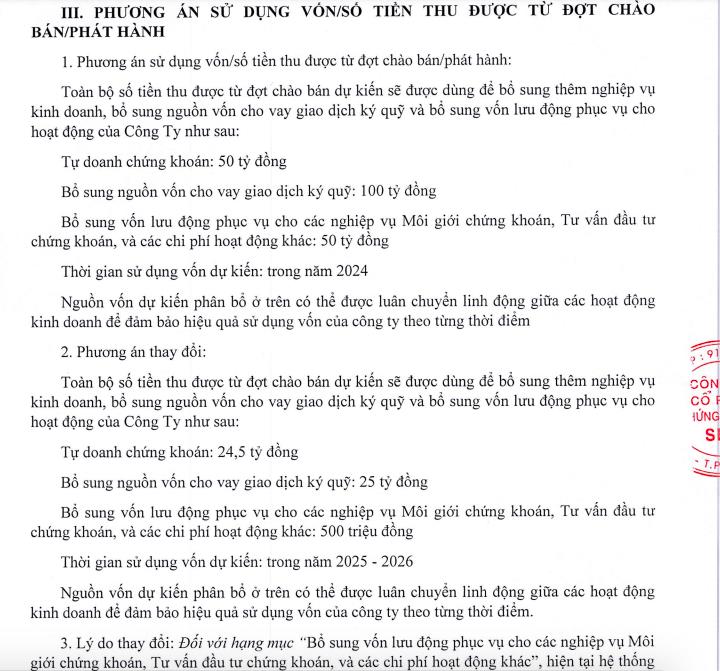 Theo phương án ban đầu, Công ty sẽ dùng 50 tỷ đồng cho tự doanh chứng khoán, 100 tỷ đồng được dùng để bổ sung nguồn vốn cho vay giao dịch ký quỹ và 50 tỷ đồng bổ sung vốn lưu động cho nghiệp vụ môi giới chứng khoán, tư vấn đầu tư chứng khoán và chi phí hoạt động khác.