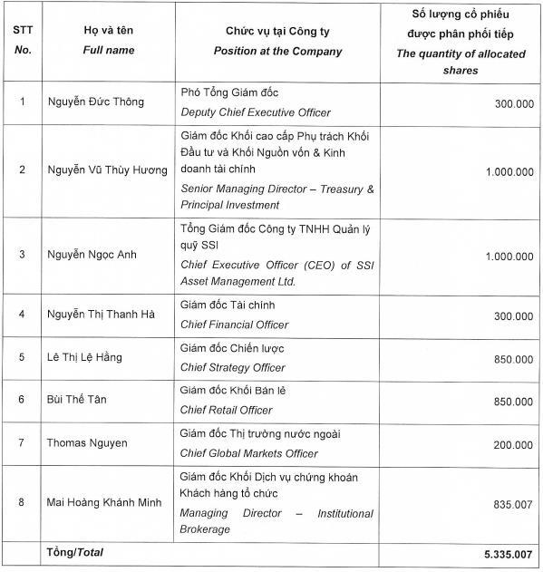 Bà Lê Thị Lệ Hằng, Giám đốc Chiến lược của SSI và ông Bùi Thế Tân, Giám đốc Khối Bán lẻ của SSI cùng được phân phối 850.000 cổ phiếu. Ông Mai Hoàng Khánh Minh, Giám đốc Khối Dịch vụ chứng khoán Khách hàng tổ chức, được phân phối 835.007 cổ phiếu.