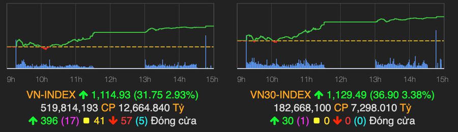 Tâm lý nhà đầu tư được cởi trói, cùng lực cầu mạnh ở những mã chủ chốt trong VN30, như VPB, VCB, VIC, VHM giúp thị trường nới rộng sắc xanh lên hai con số.