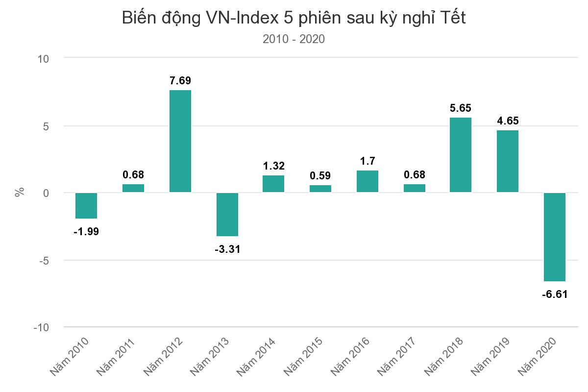 Theo thống kê của VnExpress, thị trường trong 5 phiên đầu tiên sau Tết ở giai đoạn 2010-2020 đang nghiêng về xu hướng tích cực. Trong 11 năm, có 8 năm chỉ số đại diện Sở HoSE tăng sau Tết với biên độ trung bình là 2,87%.