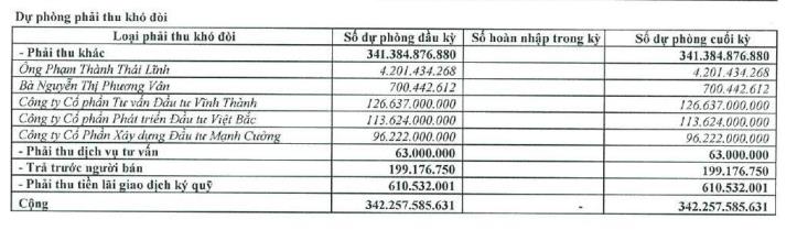 Song song đó, giá trị trích lập dự phòng các khoản phải thu khó đòi của TVB ghi nhận ở mức 342,2 tỷ đồng, trong đó chiếm phần lớn nhất là Công ty cổ phần tư vấn đầu tư Vĩnh Thành với 126,3 tỷ đồng; Công ty cổ phần phát triển đầu tư Việt Bắc là 113,6 tỷ đồng; Công ty cổ phần Xây dựng đầu tư Mạnh Cường là 96,2 tỷ đồng.