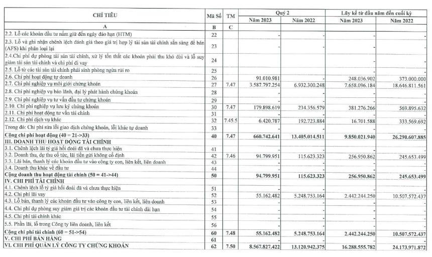 Cùng với đó, doanh thu từ môi giới chứng khoán và lãi từ các khoản đầu tư đến ngày đáo hạn (HTM) giảm lần lượt 68% và 37% về mức 2,7 tỷ đồng và 1,7 tỷ đồng.