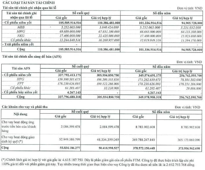 Trong đó, giá trị tài sản tài chính ghi nhận qua lãi/lỗ FVTPL là 110,3 tỷ đồng, tăng 16% so với đầu năm, bao gồm chủ yếu từ các cổ phiếu MBB, MWG, NKG và cổ phiếu khác. Ngoài ra, TVB cũng đang nắm cổ phiếu HPG, FPT dưới dạng các tài sản tài chính sẵn sàng bán (AFS), giá trị hợp lý cuối kỳ lần lượt là 106,2 tỷ đồng và 199,3 tỷ đồng.