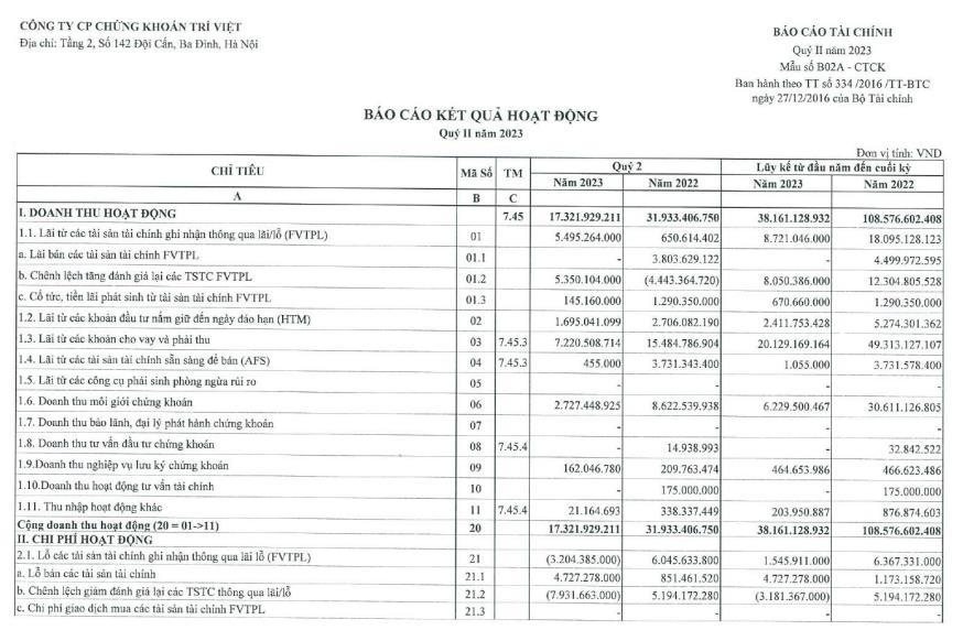 Về kết quả kinh doanh, quý II/2023, Công ty Chứng khoán Trí Việt ghi nhận doanh thu hoạt động đạt 17,3 tỷ đồng, giảm 46% so với cùng kỳ.