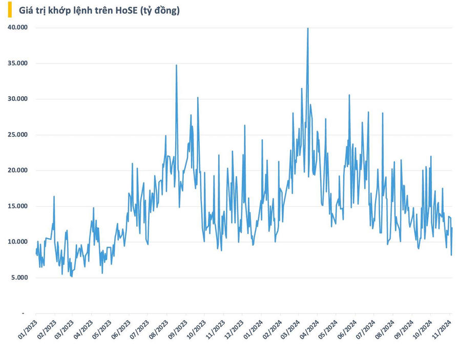 Thực tế, thanh khoản ảm đạm đã kéo dài suốt trong thời gian gần đây. Từ mức bình quân trên 20.000 tỷ đồng hồi giữa tháng 4/2024, giá trị khớp lệnh trên HOSE đã liên tục tụt dốc xuống quanh mức 13.000 tỷ đồng trong suốt một tháng trở lại đây, thậm chí nhiều phiên thanh khoản "nhúng" dưới 10.000 tỷ đồng.