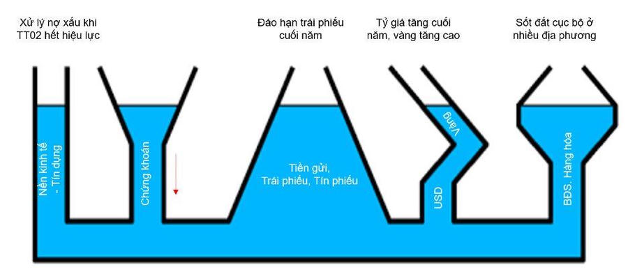 Theo chuyên gia, thị trường tài chính - tiền tệ có thể ví như một chiếc bình thông nhau giữa các kênh đầu tư của nền kinh tế, các loại tài sản tài chính, hàng hóa, bất động sản… Khi dòng tiền bị hút vào các kênh đầu tư khác hoặc phải tập trung xử lý vấn đề khác nhau, việc thiếu hụt thanh khoản ở kênh chứng khoán là điều đương nhiên.