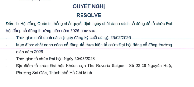 Theo đó, ngày đăng ký cuối cùng chốt danh sách cổ đông thực hiện quyền tham dự ĐHĐCĐ thường niên 2026 là ngày 23/2/2026. Thời gian tổ chức đại hội dự kiến là vào ngày 30/3/2026; địa điểm tổ chức tại Khách sạn The Reverie Saigon - Số 22-36 Nguyễn Huệ, Phường Sài Gòn, TP.HCM.