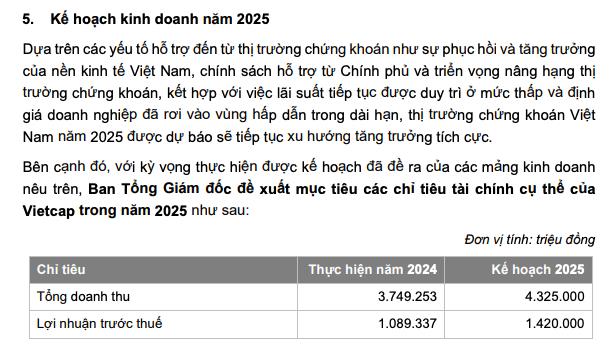 Theo tờ trình về kế hoạch kinh doanh năm 2025, tổng doanh thu dự kiến mà VCI đặt ra là đạt 4.325 tỷ đồng, tăng 15% so với thực hiện năm 2024. Lãi trước thuế đạt 1.420 tỷ đồng, tăng 30% so với con số 1.089 tỷ đồng ở năm 2024.