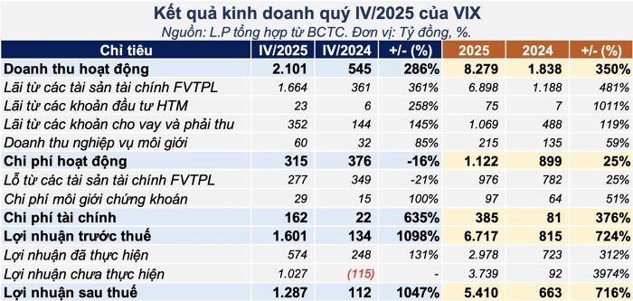 Theo báo cáo tài chính quý IV/2025, Chứng khoán VIX ghi nhận doanh thu hoạt động đạt 2.101 tỷ đồng, tăng trưởng gần 290% so với cùng kỳ năm trước. Trong cơ cấu doanh thu, mảng tự doanh đóng vai trò dẫn dắt khi lãi từ các tài sản tài chính ghi nhận thông qua lãi/lỗ (FVTPL) đạt hơn 1.660 tỷ đồng, cao gấp 4,6 lần so với quý IV/2024.