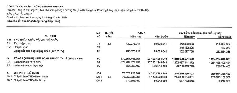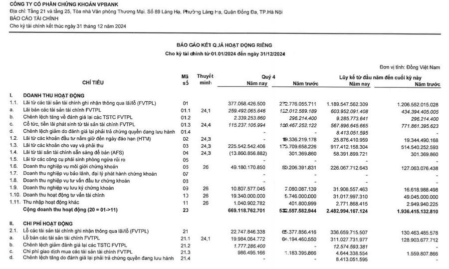 Tính chung cả năm 2024, VPBankS ghi nhận 2.482 tỷ đồng, tăng 28,2% so với cùng kỳ năm ngoái. Lợi nhuận trước thuế đạt 1.219 tỷ đồng, giảm nhẹ so với con số 1.254 tỷ đồng ở năm trước.
