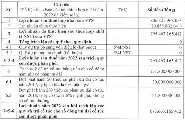 VPS sẽ phân phối gần 152 tỷ đồng từ 796 tỷ đồng lãi sau thuế (sau khi trích quỹ) để chia cổ tức bằng tiền cho cổ đông nắm giữ cổ phần ưu đãi, được phát hành năm 2017 (50 triệu cổ phiếu) và năm 2018 (203 triệu cổ phiếu). Tỷ lệ cổ tức 6% cho mỗi đợt.