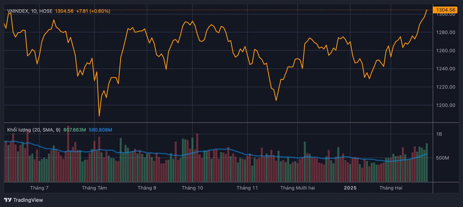 Từ đầu tháng 2 đến nay, thanh khoản đã có sự cải thiện so với giai đoạn cuối năm trước với KLGD trung bình 20 phiên đạt gần 600 triệu cổ phiếu. Tuy nhiên, cũng cần lưu ý rằng mức này vẫn thấp hơn so với hồi tháng 3/2024 khi lần đầu chạm vùng 1.300 điểm với KLGD trung bình 20 phiên trên 1 tỷ cổ phiếu.
