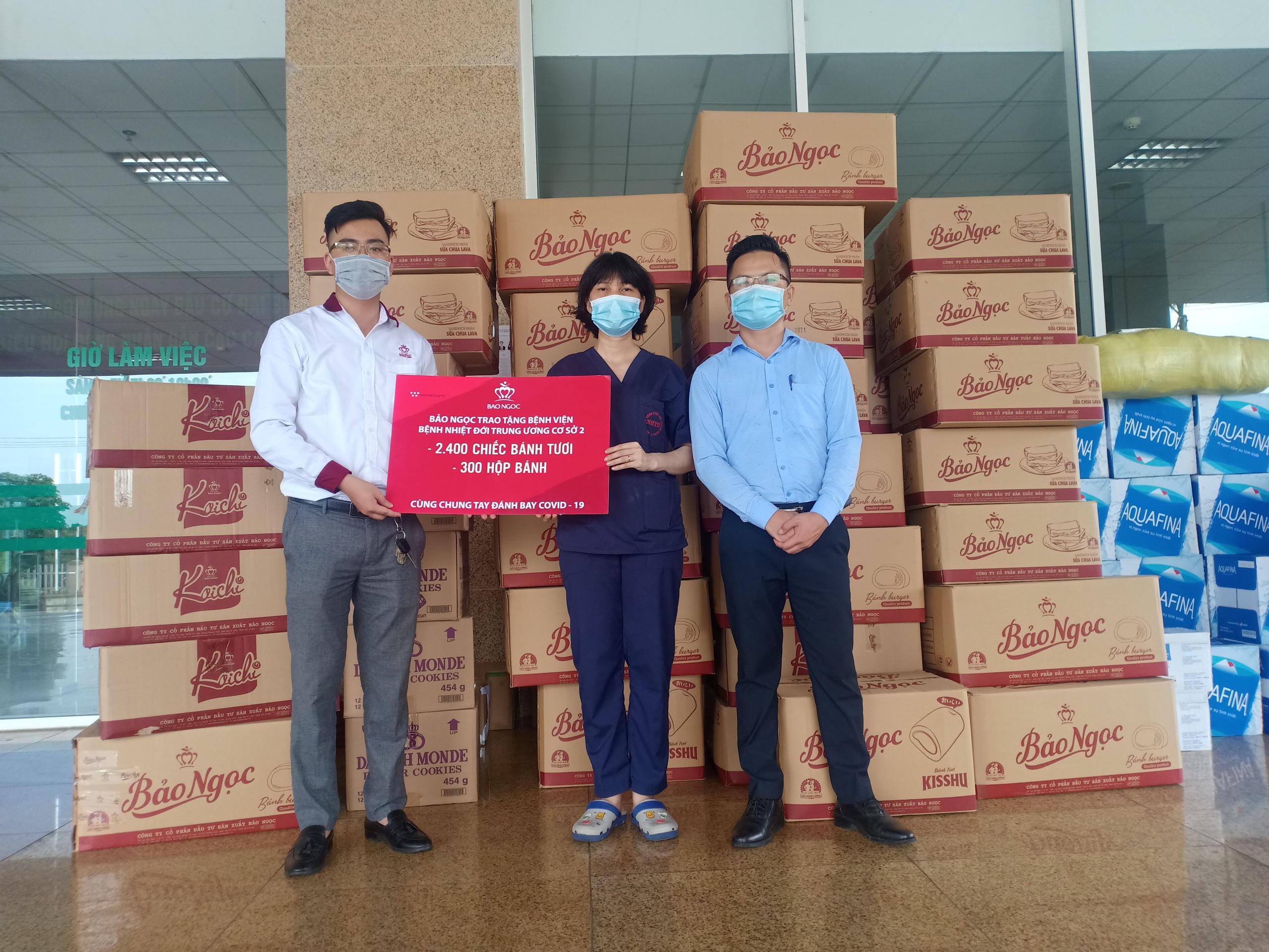Cụ thể, đã có 560 chiếc bánh tươi và 132 hộp bánh được Bảo Ngọc trao tặng cho Trung tâm kiểm soát bệnh tật TP.Hà Nội (CDC Hà Nội). Ngoài ra, Bảo Ngọc còn trao tặng 2.400 chiếc bánh tươi và 300 hộp bánh cho Bệnh viện Nhiệt đới Trung ương cơ sở 2. Đồng hành cùng Công ty Bảo Ngọc, Công ty Á Long đã trao tặng cho Bệnh viện Nhiệt đới Trung ương cơ sở 1 và Bệnh viện K - cơ sở Tân Triều mỗi bệnh viện 5.000 chiếc khẩu trang y tế.