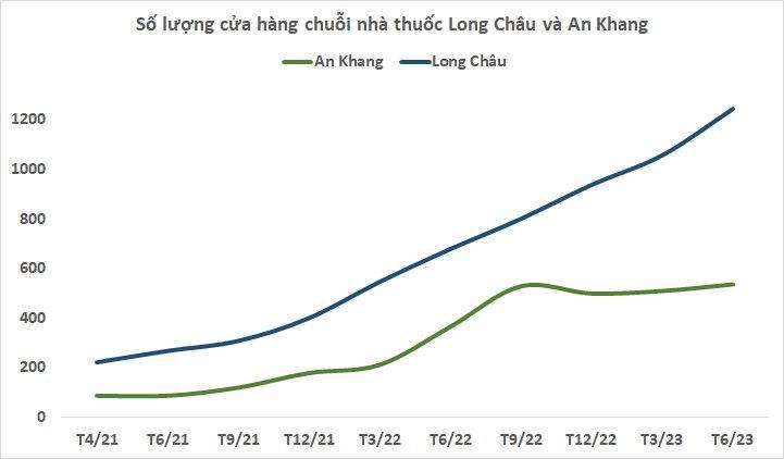 Nếu nhìn sang đối thủ cạnh tranh trực tiếp với An Khang là Long Châu của FPT Retail (FRT), chuỗi nhà thuốc này đang liên tục mở rộng quy mô với tốc độ nhanh. Số lượng cửa hàng Long Châu tại thời điểm giữa năm 2023 đã đạt mốc 1.243, tăng gần 200 cửa hàng chỉ sau 6 tháng, tương ứng gấp gần 5 lần tốc độ tăng của An Khang.