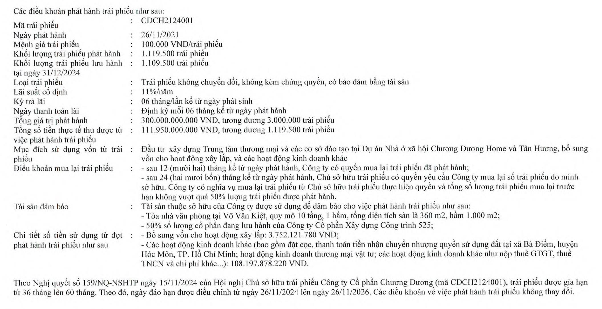 Đáng chú ý, Chương Dương hiện có khoản nợ trái phiếu mã CDCH2124001 với dư nợ tại thời điểm cuối năm 2024 là 110,95 tỷ đồng. Trái phiếu này được phát hành để đầu tư xây dựng trung tâm thương mại và các cơ sở đào tạo thuộc dự án nhà ở xã hội Chương Dương Home và Tân Hương, cũng như bổ sung vốn cho hoạt động xây lắp và các hoạt động kinh doanh khác. Đặc biệt, trái phiếu này đã được gia hạn thời gian đáo hạn thêm 2 năm, từ ngày 26/11/2024 sang ngày 26/11/2026.