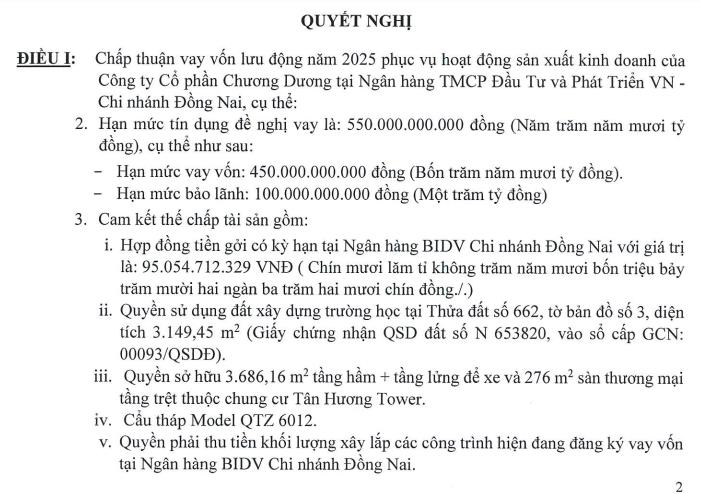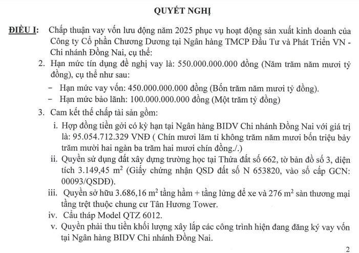 Để đảm bảo nghĩa vụ tín dụng, Chương Dương Corp đã cam kết thế chấp nhiều loại tài sản có giá trị, cụ thể như hợp đồng tiền gửi có kỳ hạn tại BIDV - chi nhánh Đồng Nai giá trị hơn 95 tỷ đồng; quyền sử dụng đất xây dựng trường học tại thửa đất số 662, tờ bản đồ số 3, diện tích 3.149,45 m2; quyền sở hữu 3.686,16 m2 tầng hầm và tầng lửng để xe cùng 276 m2 sàn thương mại tầng trệt thuộc chung cư Tân Hương Tower; quyền sử dụng đất trồng cây hàng năm khác có diện tích 1.600 m2; quyền sử dụng đất thương mại dịch vụ diện tích 1.660 m2; cẩu tháp Model QTZ 6012.