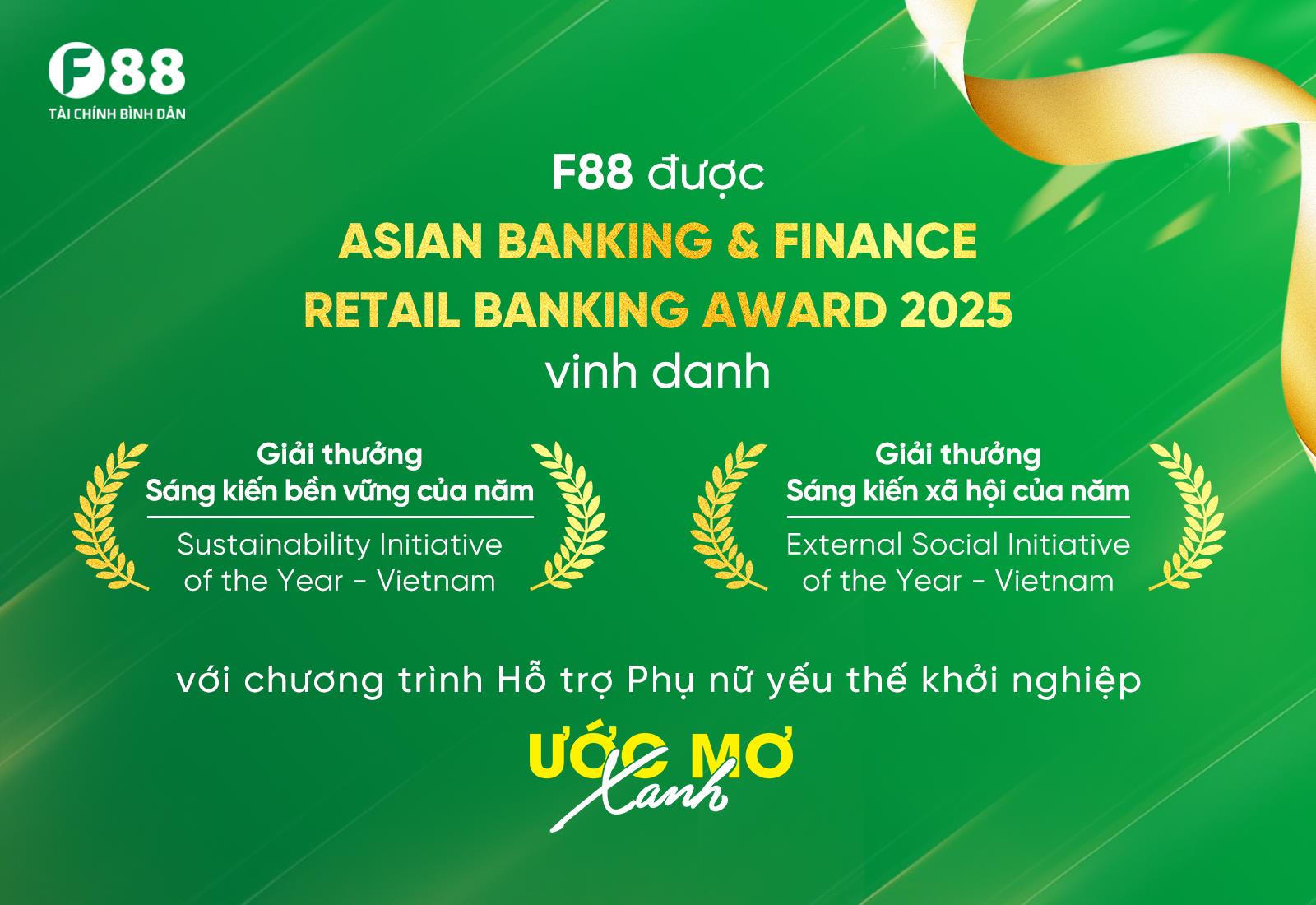 Ước mơ xanh là chương trình hỗ trợ phụ nữ yếu thế khởi nghiệp do F88 triển khai. Mới đây, chương trình đã giúp F88 nhận được hai giải thưởng quốc tế là Sáng kiến bền vững của năm và Sáng kiến xã hội của năm do tạp chí Asian Banking and Finance trao tặng.