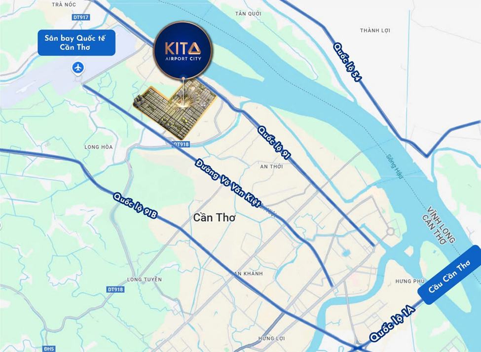 KITA Airport City có tổng diện tích hơn 150 ha, nằm cách Sân bay Quốc tế Cần Thơ chỉ 3 km cùng hệ thống giao thông thủy bộ thuận lợi, kề cạnh 3 trục đường giao thông chính là Quốc lộ 91, Quốc lộ 91B, đường Võ Văn Kiệt và các tuyến đường tỉnh nối liền các trục chính.