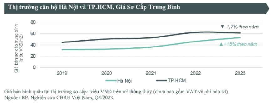 Tại thời điểm cuối năm 2023, giá bán sơ cấp trung bình tại Hà Nội đạt 53 triệu đồng/m2 (chưa bao gồm VAT và phí bảo trì), tăng 4,6% theo quý và 14,6% theo năm. Đây cũng là mức giá bằng với mức đã ghi nhận được ở TP.HCM giai đoạn 2020 - 2021.