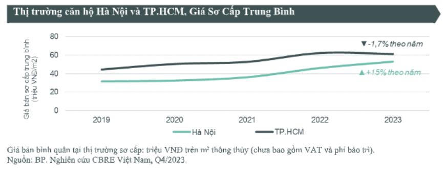 Trong khi đó, hiện giá bán sơ cấp căn hộ tại TP.HCM đã chững lại và đạt hơn 61 triệu đồng/m2, giảm 1,7% so với năm 2022, do số lượng nguồn cung cao cấp nhưng nằm ở các vị trí xa trung tâm nên kết nối chưa thuận lợi và nguồn cung trung cấp trong năm 2023 cao hơn năm trước.