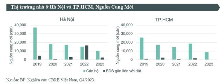 Về tỷ lệ hấp thụ, báo cáo CBRE cho biết, Hà Nội và TP.HCM ghi nhận hơn 22.000 căn nhà ở bán được trong năm 2023, chỉ xấp xỉ một nửa số căn bán được trong năm 2022.