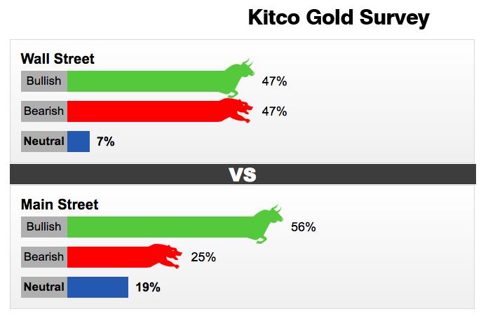 Khác với xu hướng dự đoán giá vàng sẽ tăng tiếp trong thời gian qua, ở tuần này, tỷ lệ áp đảo người tham gia khảo sát tin tưởng vàng tăng mạnh không còn. Thay vào đó, nhiều chuyên gia và giới phân tích nhận định giá vàng sẽ giảm hoặc đi ngang. Trong cuộc khảo sát của Kitco, 15 chuyên gia phố Wall chia thành hai phe đồng đều giữa tăng và giảm, với mỗi bên nhận được 7 phiếu (tương đương 47%), còn 1 người nhận định giá vàng sẽ đi ngang (tương đương 7%).
