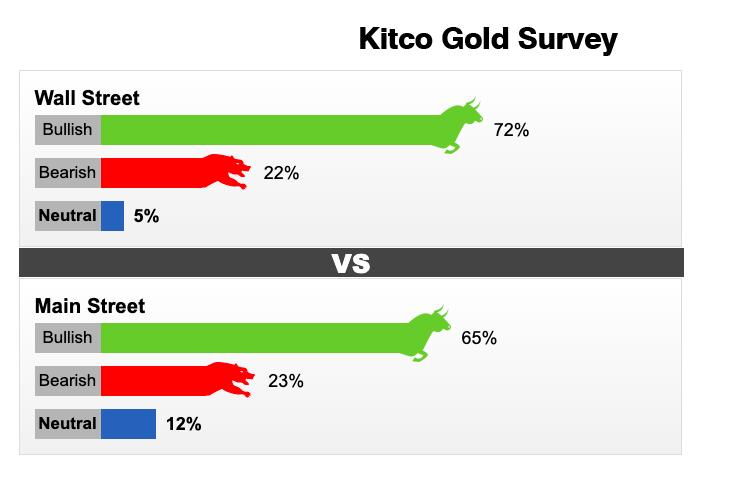 Trong số các nhà phân tích Phố Wall tham gia cuộc khảo sát vàng của Kitco News, có 13 người (tương đương 72%) người tham gia dự báo giá vàng sẽ tăng. Chỉ có 3 nhà phân tích (tương đương 22%) tin tưởng giá kim loại quý sẽ giảm và 1 người (5%) nhận định không có nhiều biến động trong tuần này.