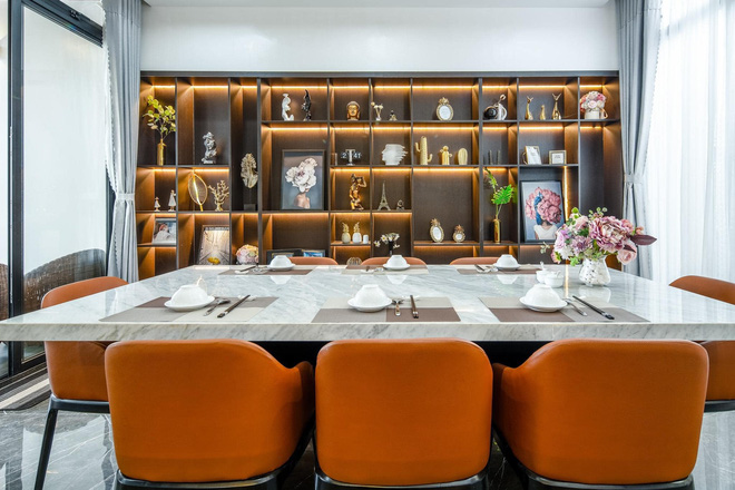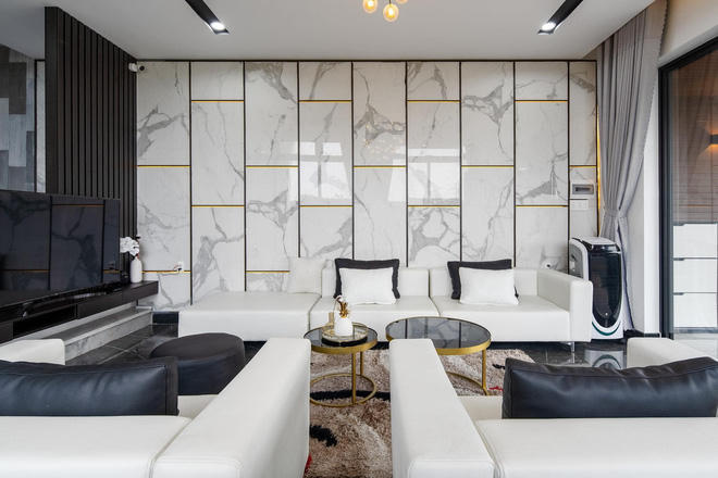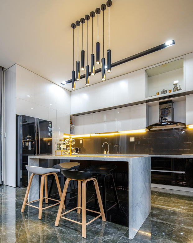 Tầng một bao gồm khu vực phòng khách và phòng bếp. Phòng khách có tông màu chủ đạo là trắng, xám đen với hệ nội thất tối giản nhưng vẫn sang trọng, tiện nghi. Phòng bếp rộng rãi gồm khu vực nấu nướng và bàn ăn. Chất liệu chủ đạo trong không gian bếp là đá với màu sắc trung tính, tạo sự sang trọng, tiện nghi.